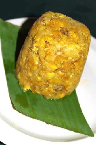 In a pilón mash 3 cloves of garlic into paste with a pinch of salt and olive oil. As you mash the garlic, add the plantain pieces and mash them together. In this phase you can create different textures and flavors by the method of mashing. Next, transfer the mofongo from the pilón to a well oiled bowl. Press the mofongo into the bowl making it compact and giving the mofongo its distinctive shape. From there it goes to the plate and off we go!