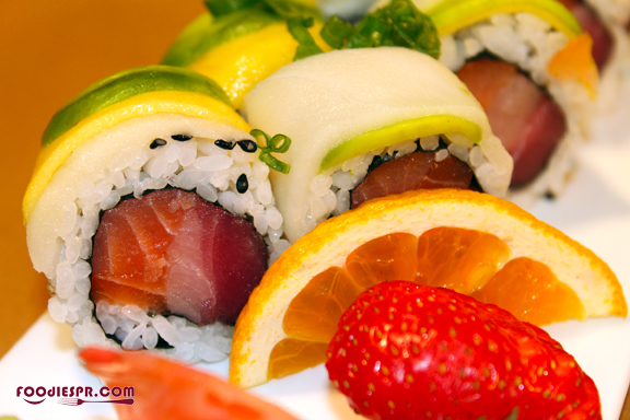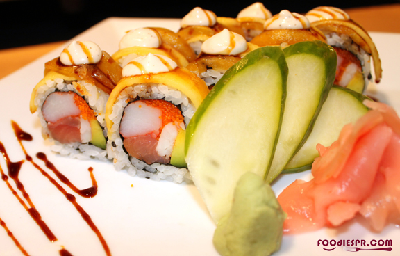 Todos los platos de sushi son servidos con jengibre y wasabi. El jengibre se come para limpiar el paladar. El wasabi ayuda a matar las bacterias que se puedan encontrar en el pescado crudo. Chef Marion tiene una tremenda habilidad en creación y presentación de sushi. Hace cuatro años creó su propio rollo llamado Fusion roll. Luego del video le pedimos que lo hiciera y él con mucho gusto no los dio a probar. El rollo tiene salmón ahumado, cangrejo, camarón, aguacate, y caviar dulce dentro del arroz. Encima tiene lascas de mango y plátano intercaladas. Definitivamente es una fusión, una rica fusión de sabores entre salado y dulce, japonés y caribeño. Yum!