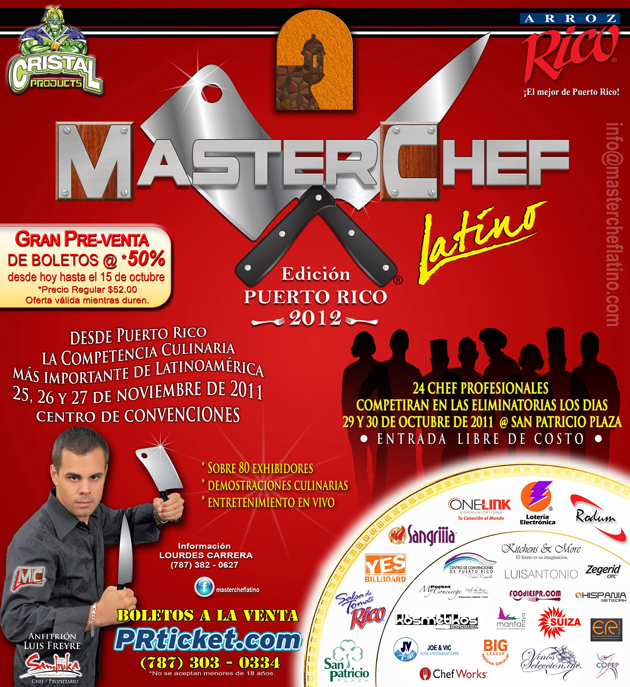 Mi gente!!! Los boletos para MasterChef Latino, Edición Puerto Rico en PRE-VENTA a 50% de DESCUENTO desde HOY hasta el 15 de octubre de 2011. …NO TE PIERDAS ESTE 25, 26 y 27 de noviembre en el Centro de Convenciones de PR… La competencia Culinaria más IMPORTANTE de Latinoamérica. Sobre 80 exhibidores, restaurantes, bebidas y entretenimiento en VIVO.. SÉ TESTIGO DEL PRIMER COLISEO CULINARIO EN EL MUNDO..un evento de MCL Entertainment Group, LLC.